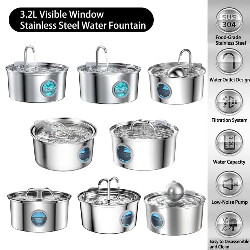 High-quality 3.2L stainless steel automatic pet water fountain series made of food-grade SUS 304 material.