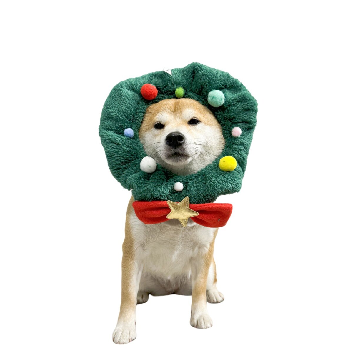 Soft Christmas wreath-style dog collar with plush green texture and red bow.