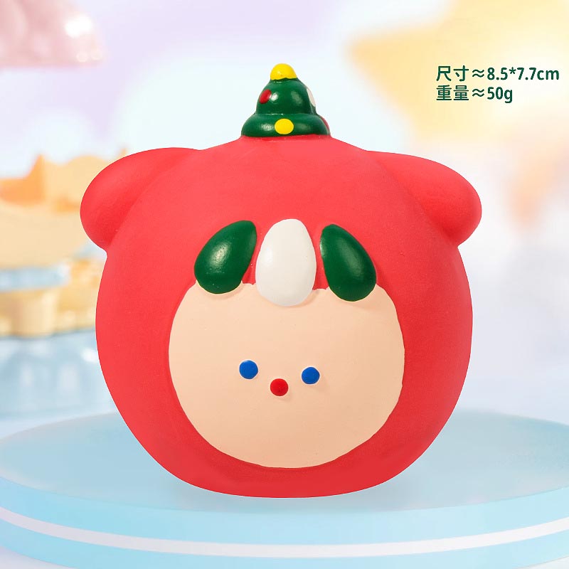 Our OEM pet toy factory produces Christmas TPR round squeaky toys in four vibrant styles — Santa, Snowman, Tree, and Reindeer.