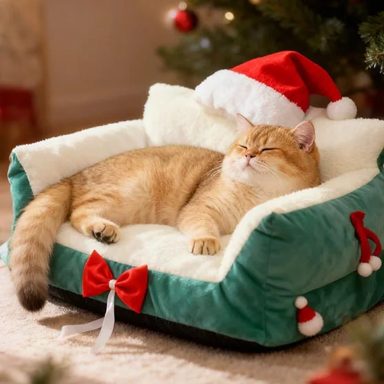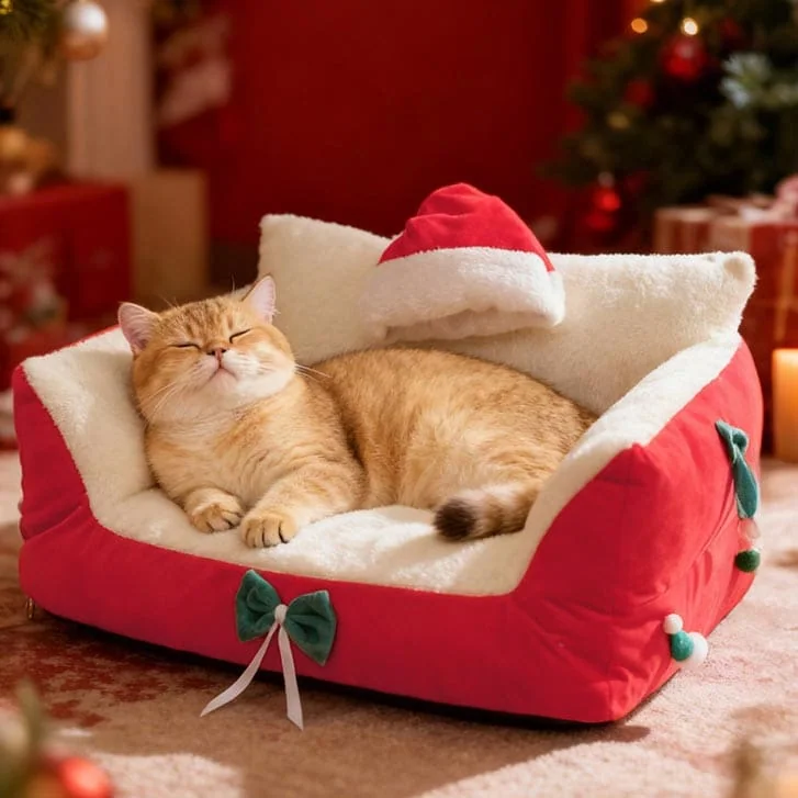 Soft Christmas pet sofa bed with plush surface, decorative bows, and mini Santa hat.