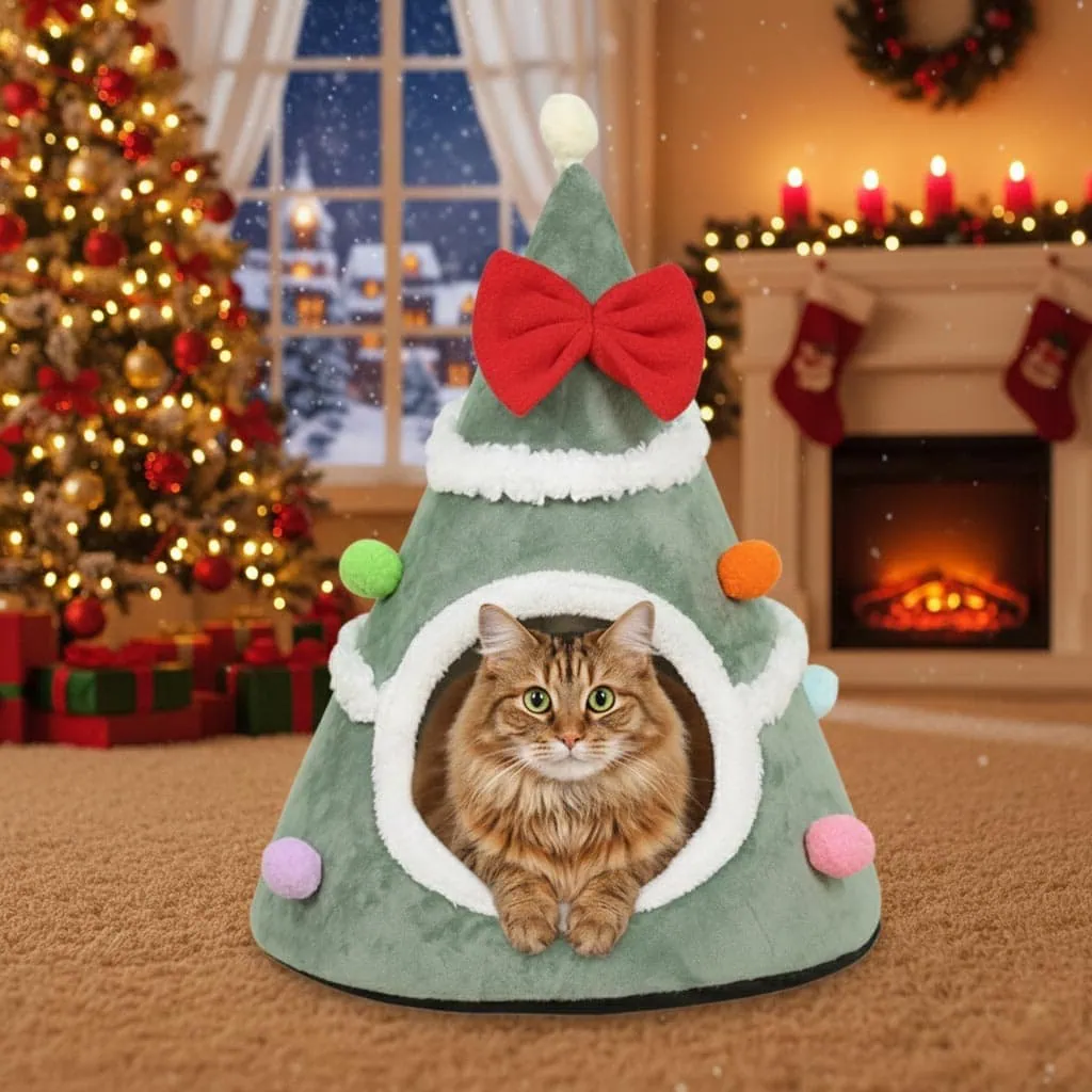 Shaped like a Christmas tree and decorated with plush ornaments and a red bow, it provides pets with a private, warm sleeping space.