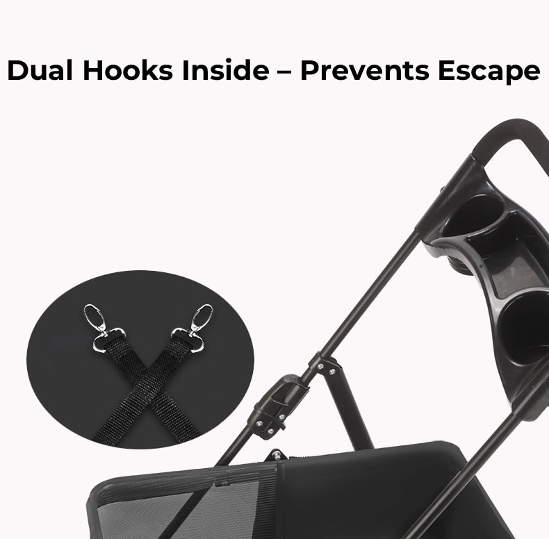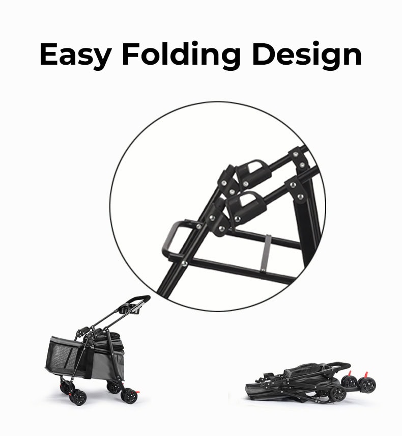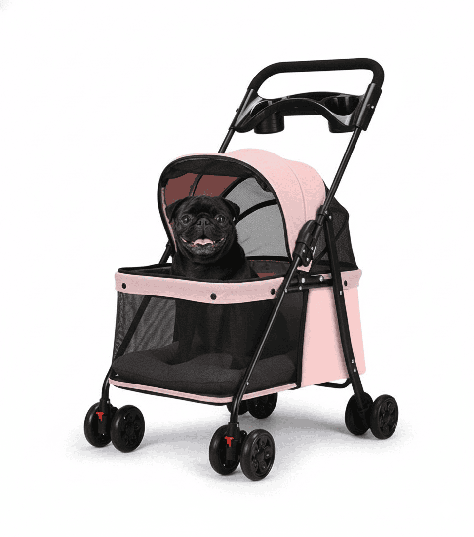 The four-wheel stroller structure ensures stable movement on various surfaces, while the ergonomic push handle allows smooth and effortless operation. An integrated storage basket adds functional value by offering space for pet accessories, treats, or shopping items, making the stroller suitable for both pet owners and urban lifestyles.
