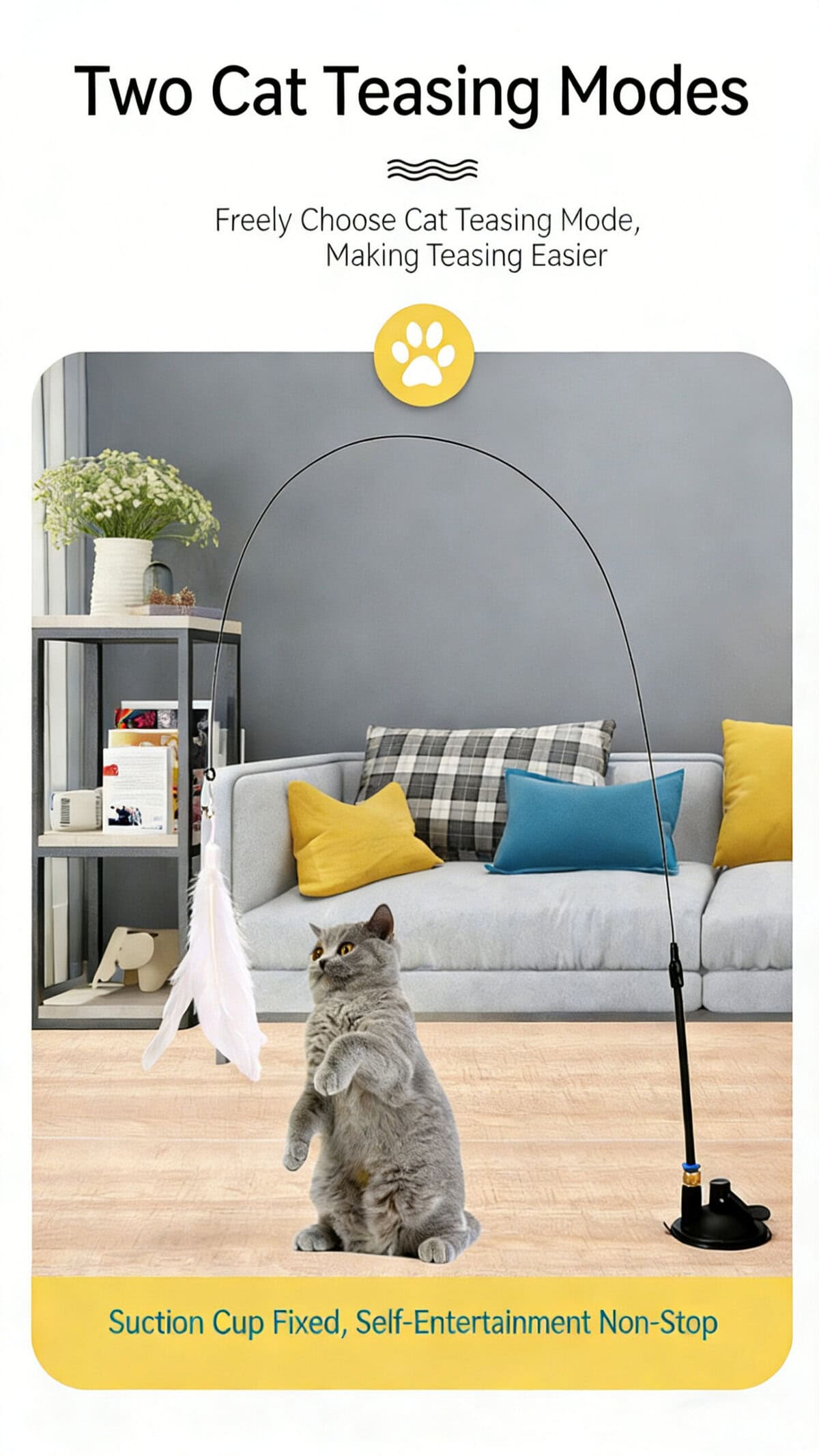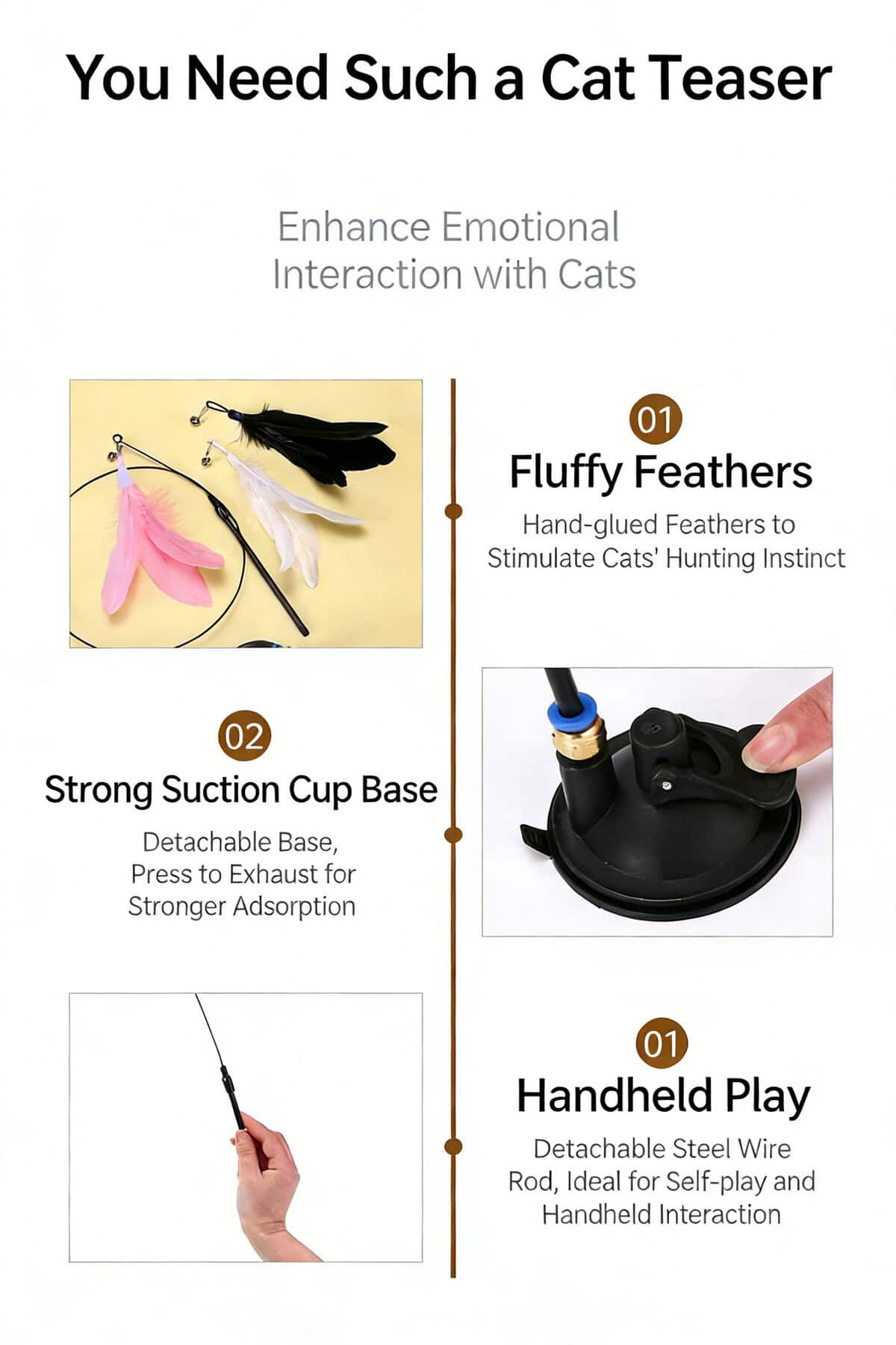 Structure: Long elastic steel wire wand with strong suction cup base and replaceable teaser heads
