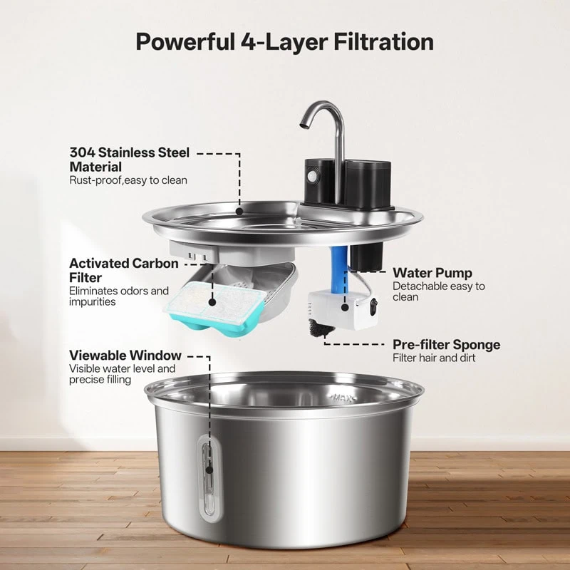 Compact stainless steel wireless pet water fountain with short spout for smooth, quiet drinking
