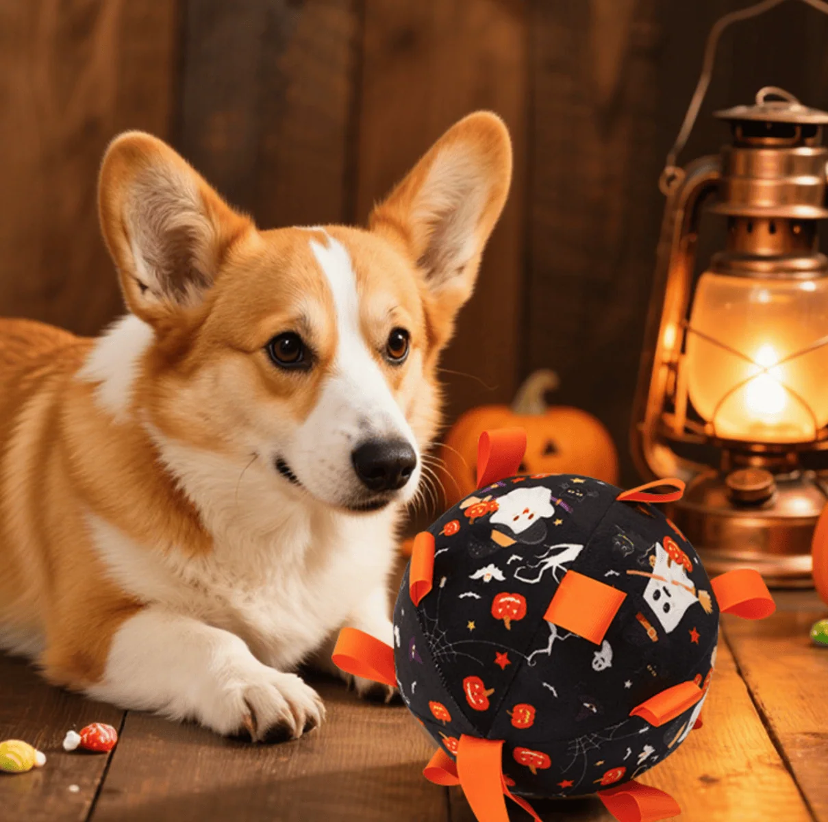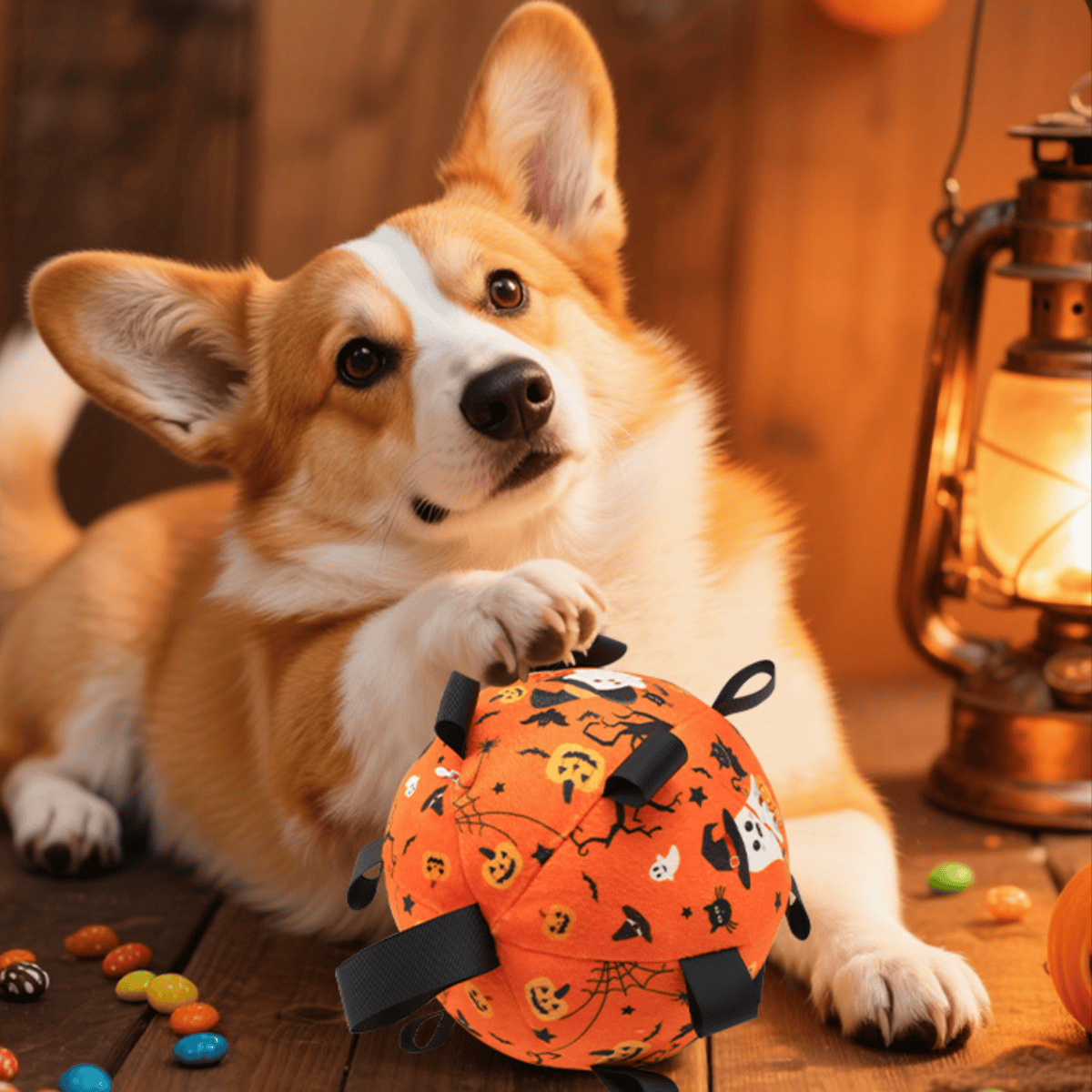 Halloween-themed plush squeaky ball for dogs, designed for outdoor fetch, chewing, and training games.