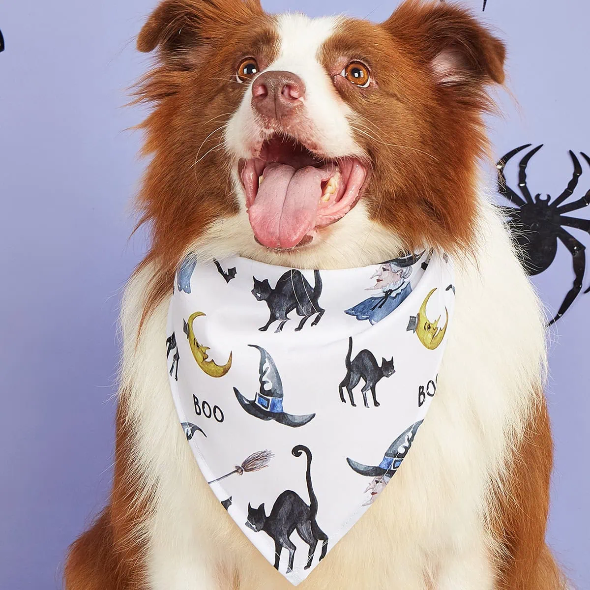 Festive Halloween-themed dog bandanas featuring various spooky prints such as ghosts, pumpkins, bats, and witches.