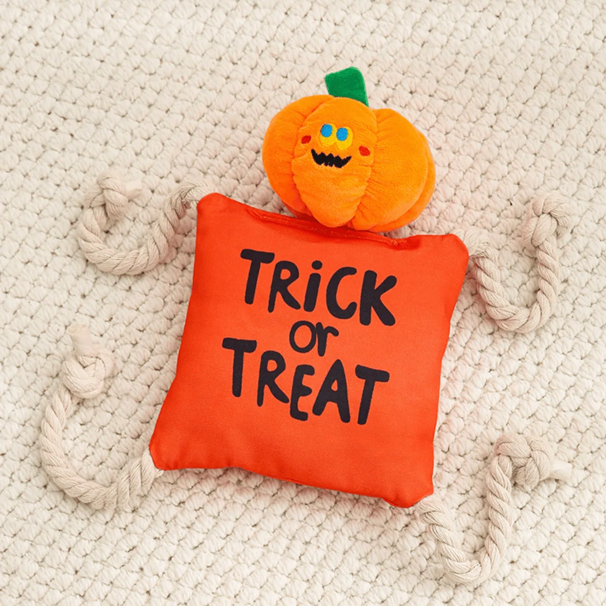 Pumpkin Rope Toy – Plush pumpkin with “Trick or Treat” embroidery and strong rope arms, perfect for tug-of-war.