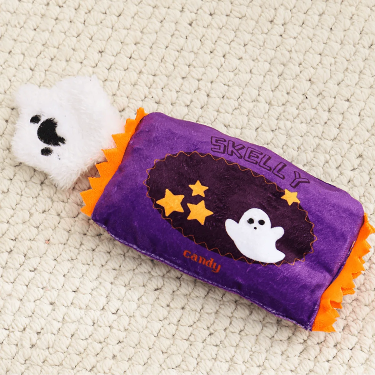Ghost Candy Toy – Soft candy-shaped toy with ghost pattern and squeaker, lightweight and easy to carry.