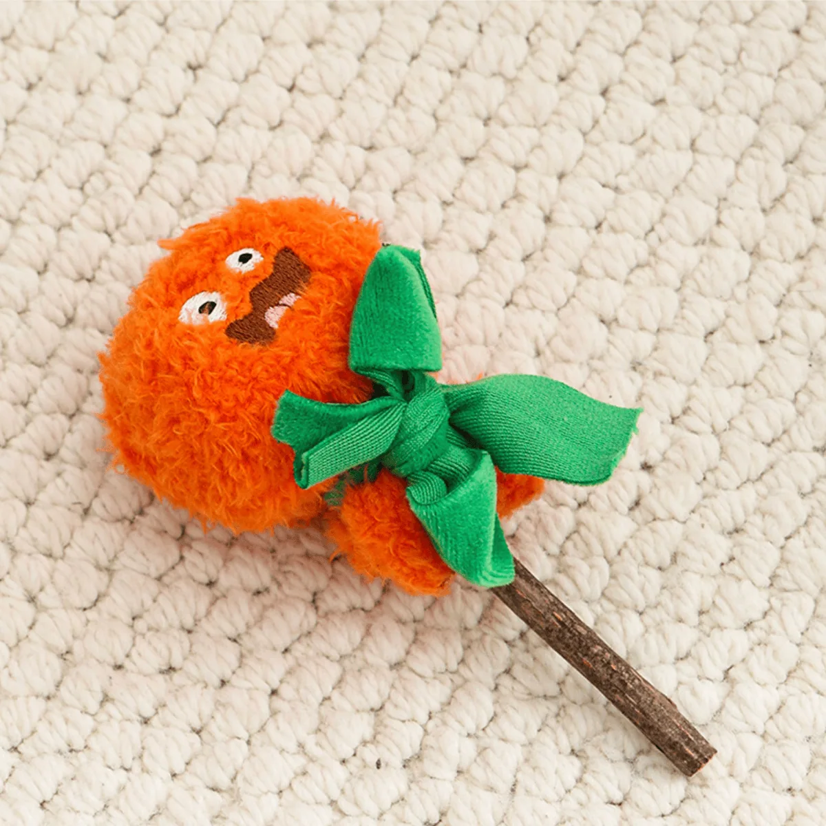 Pumpkin Lollipop Toy – Mini plush pumpkin with green bow, great for small dogs and gift boxes.