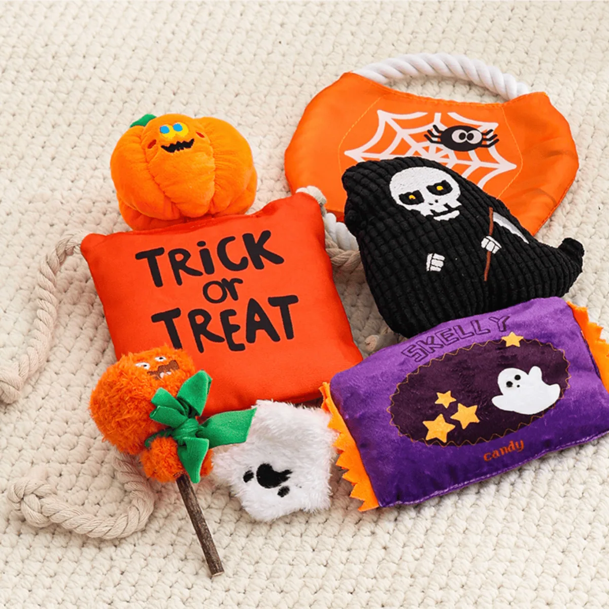 A 5-piece Halloween-themed squeaky plush toy set for dogs — perfect for festive fun, chewing, and interactive play.