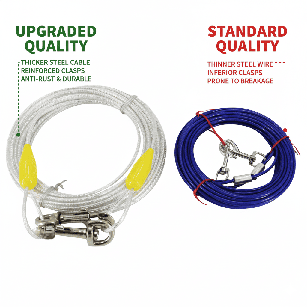 Premium 10-meter dog tie-out cable made with reinforced stainless-steel wire core and protective PVC coating, offering superior strength, flexibility, and weather resistance.