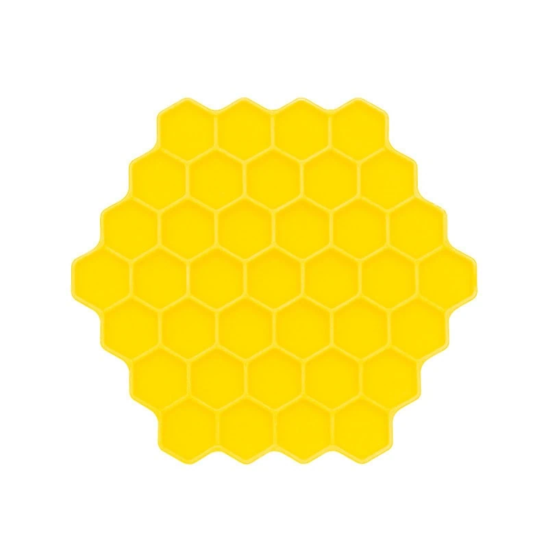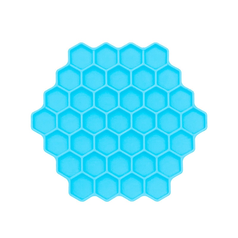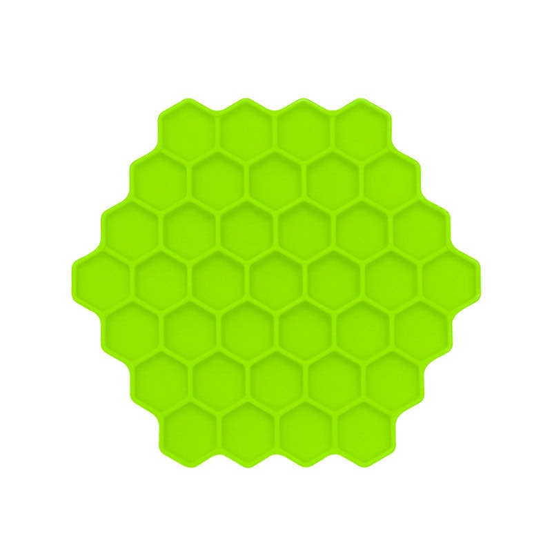 Hexagonal honeycomb-style mat with uniform raised cells to distribute treats and slow licking.