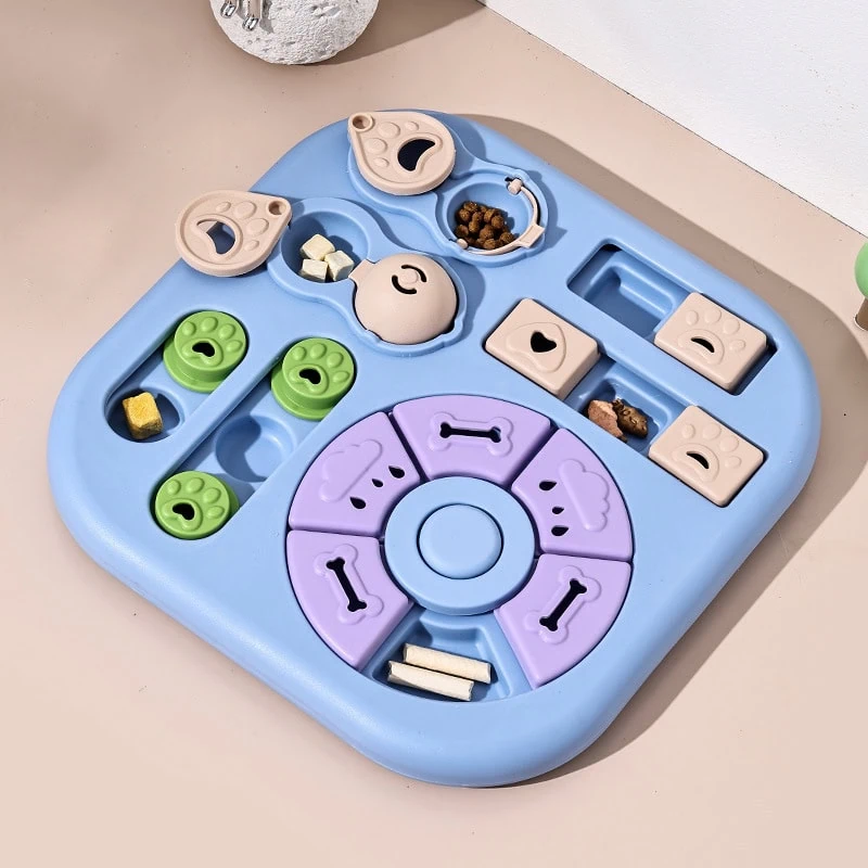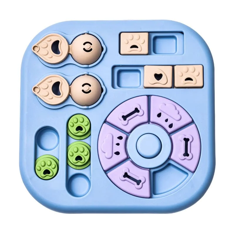 This multi-functional interactive dog puzzle feeder features a unique 5-in-1 layout with rotating plates, sliding covers, paw-shaped buttons, and hidden compartments. Dogs can push, rotate, and lift parts to find treats, keeping their brain active and reducing anxiety.