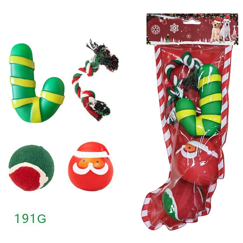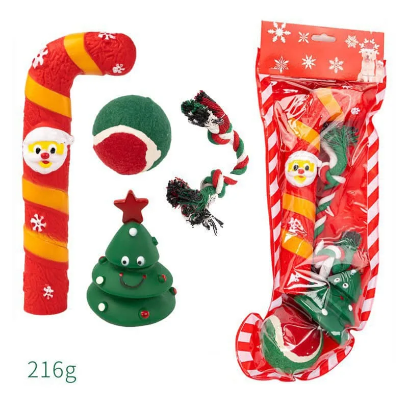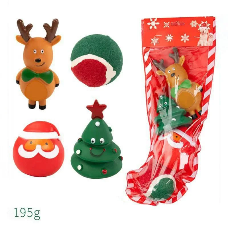 The CPS027 Christmas Dog Toy Stocking Gift Set is designed for retailers, pet brands, supermarkets and e-commerce sellers preparing for seasonal Christmas promotions. Each stocking contains a curated mix of dog toys such as TPR chew toys, squeaky rubber characters, rope tug toys, Christmas-themed tennis balls and plush holiday figures. These toys encourage active play, chewing, fetching and interactive bonding between pets and owners.