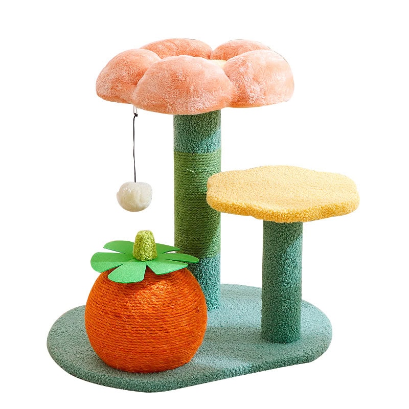 A customizable B2B model from our professional cat tree manufacturer line, designed with a flower-shaped perch, orange toy base, and durable sisal post.