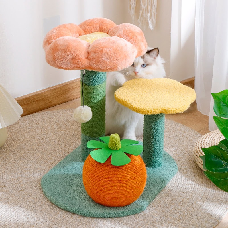 This flower-style cat scratching tree is designed for international wholesalers and pet brands seeking reliable OEM/ODM production from an experienced cat tree manufacturer. It features a stable MDF base, soft plush platform, decorative flower canopy, and a durable sisal-wrapped scratching post.