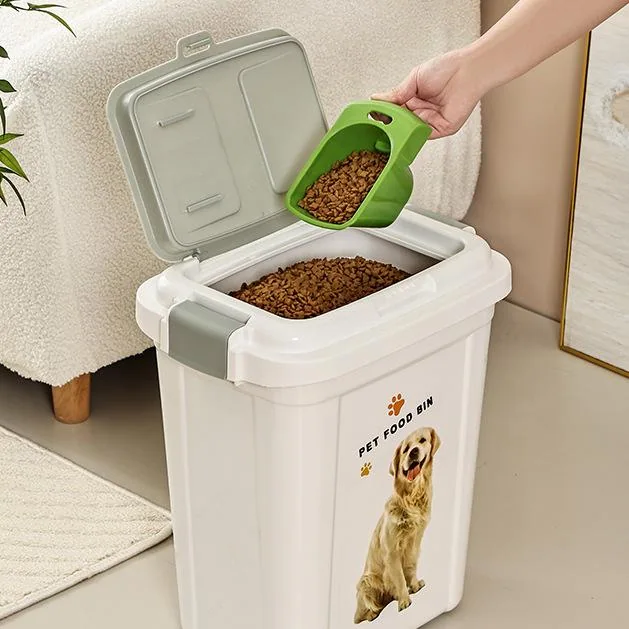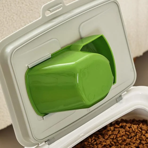 Its reinforced PP body, wide opening, and optional scoop make it efficient for daily use. The container’s robust structure supports long-term storage of dry dog food, cat food, or bulk feed, making it suitable for supermarkets, warehouses, and subscription delivery programs.