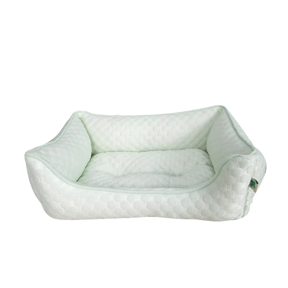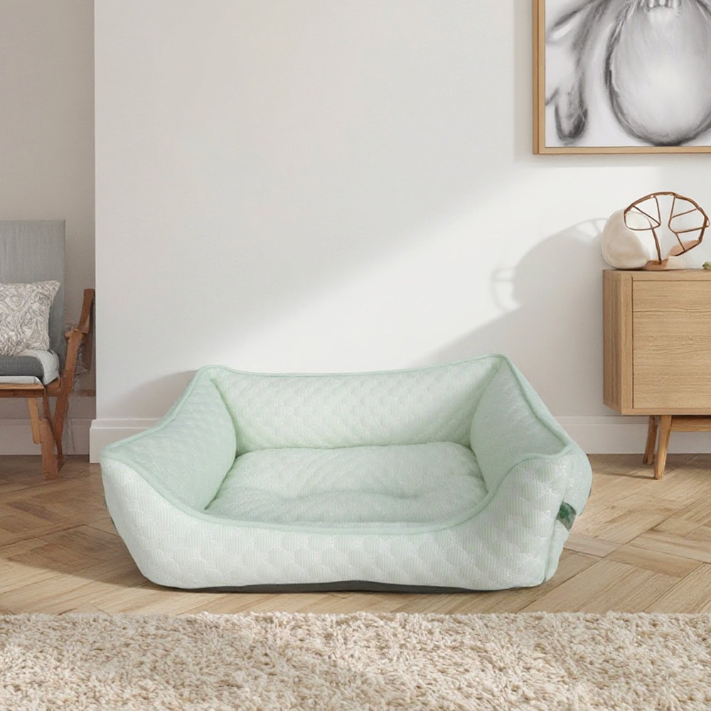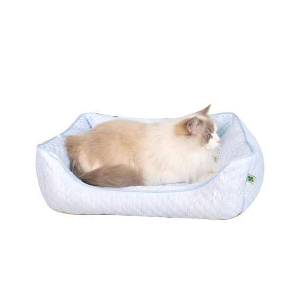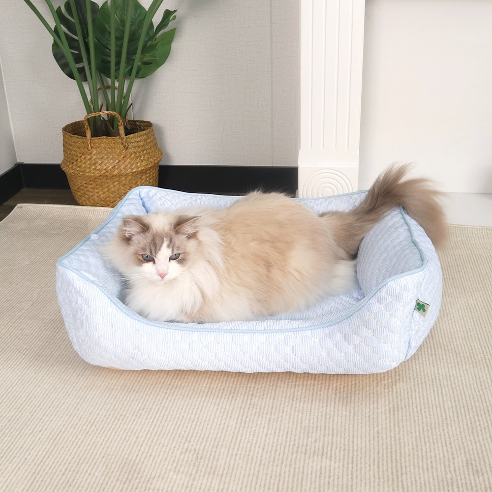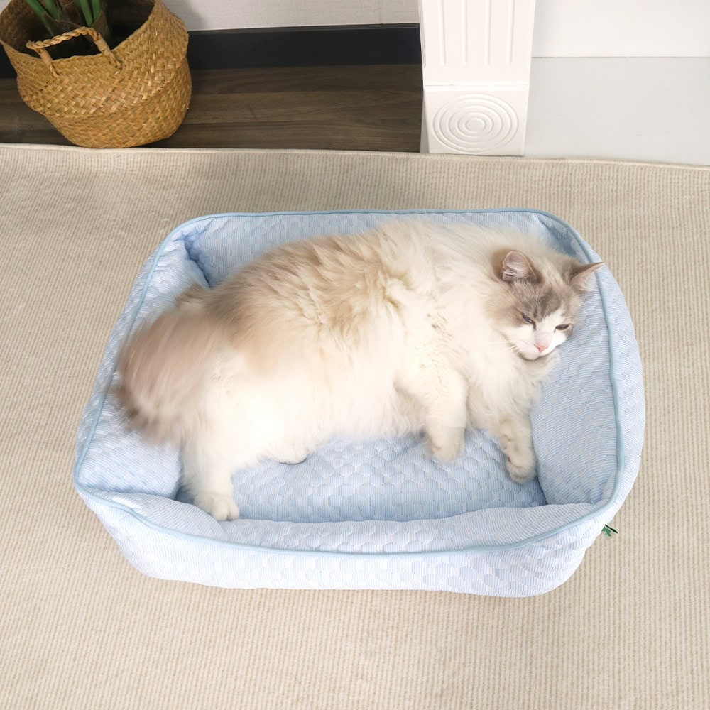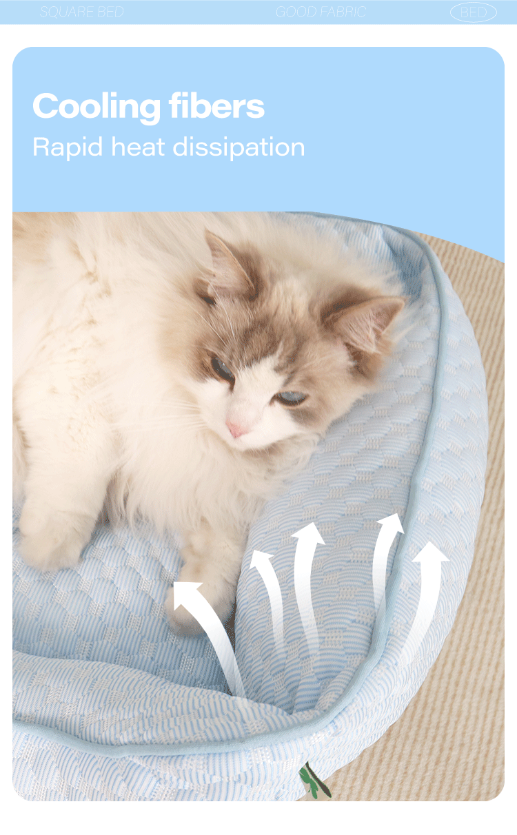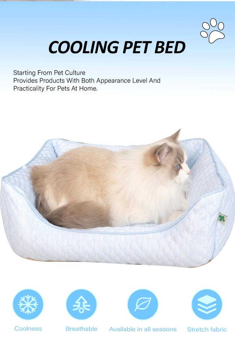 The semi-enclosed square structure provides gentle surrounding support while allowing easy entry and exit. Raised edges create a sense of security and can be used as head or neck support, making the bed suitable for both cats and dogs. The cooling surface fabric is soft, elastic, and skin-friendly, offering a premium tactile experience while maintaining durability for daily use.