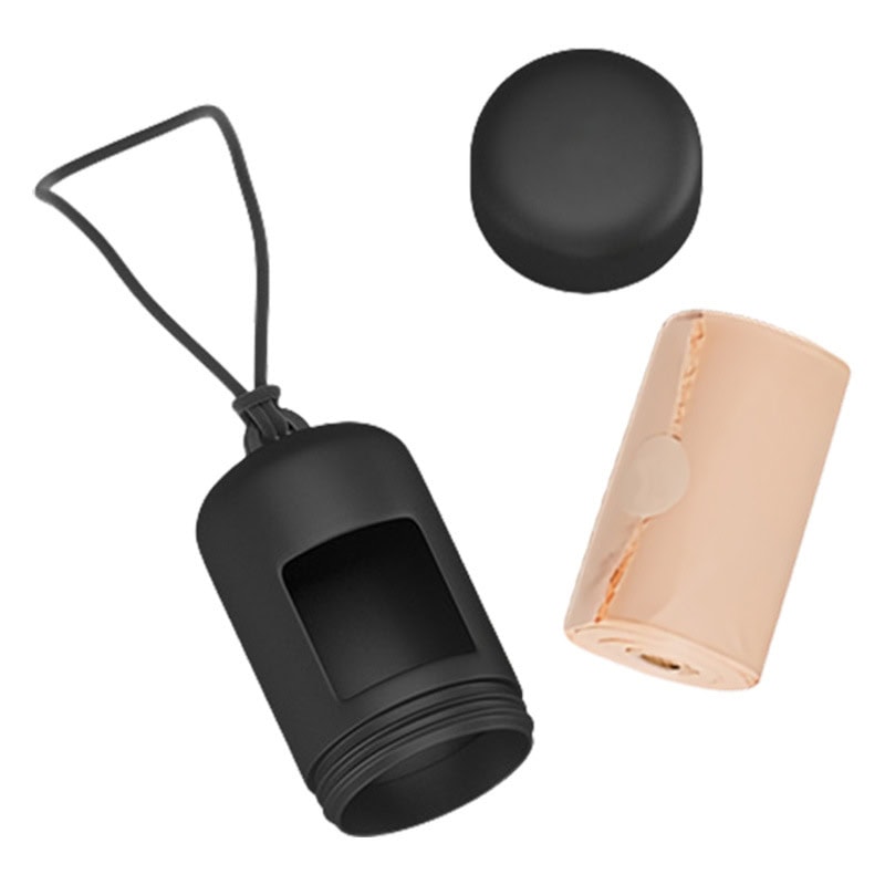 The dispenser features a secure twist-off lid, making roll replacement fast and effortless. The attached hanging strap can be looped onto any leash, harness, backpack, or belt, keeping waste bags within reach at all times. Perfect for dog owners who value simplicity, portability, and clean design.