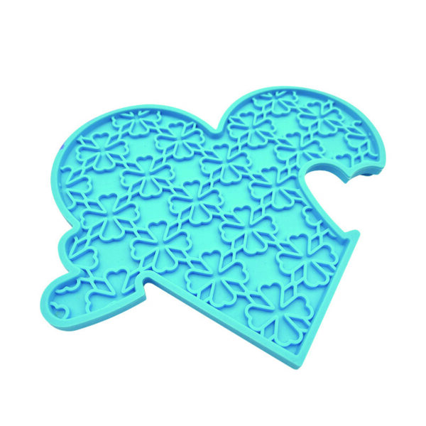 Abstract puzzle-piece shaped mat with floral relief patterns??unique form factor that spreads treats across many small nodules.