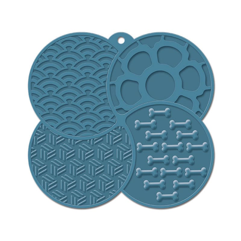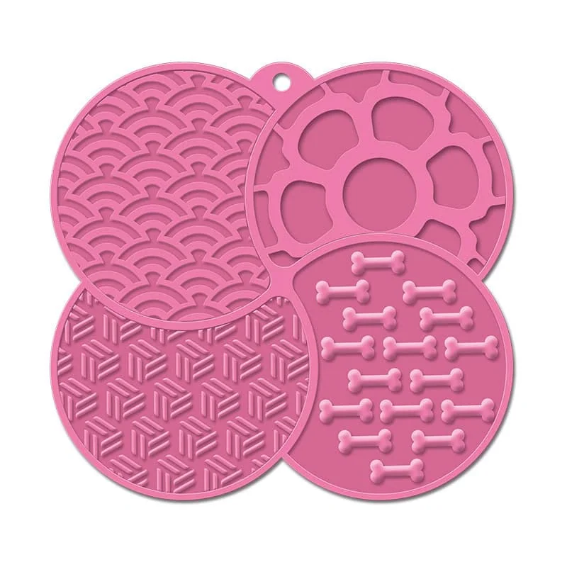 Four-section mat combining different textures??radial, linear, geometric??for layered slow licking enrichment.