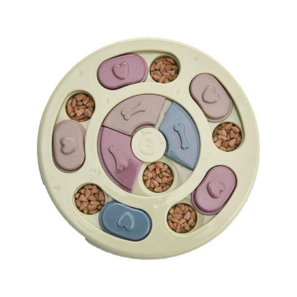 This round interactive puzzle toy combines feeding and fun. With a rotating center and sliding panels, it challenges your dog to use nose and paws to find hidden snacks, stimulating natural foraging instincts.