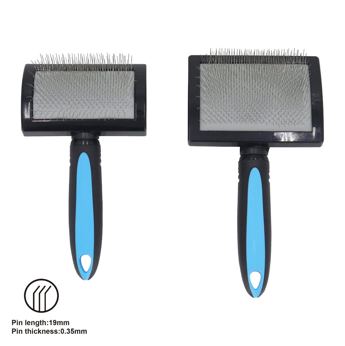Professional slicker brush with 19 mm stainless-steel pins (0.35 mm thickness) for deep detangling and undercoat care.