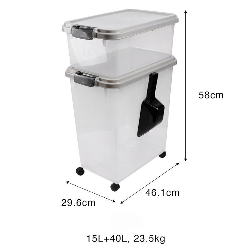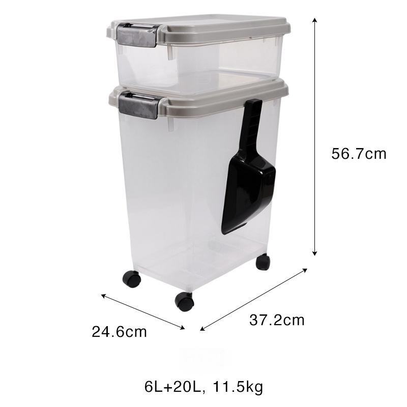 The set offers multiple upper–lower capacity combinations (20L+6L, 30L+10L, 36L+10L, 40L+15L), meeting various storage needs for dog and cat dry food.