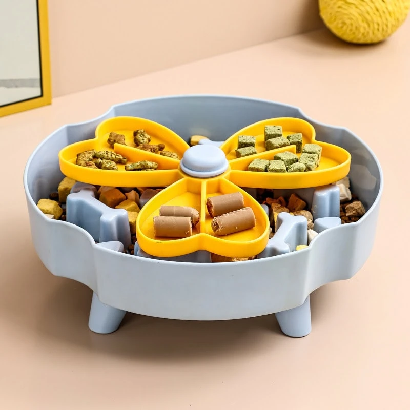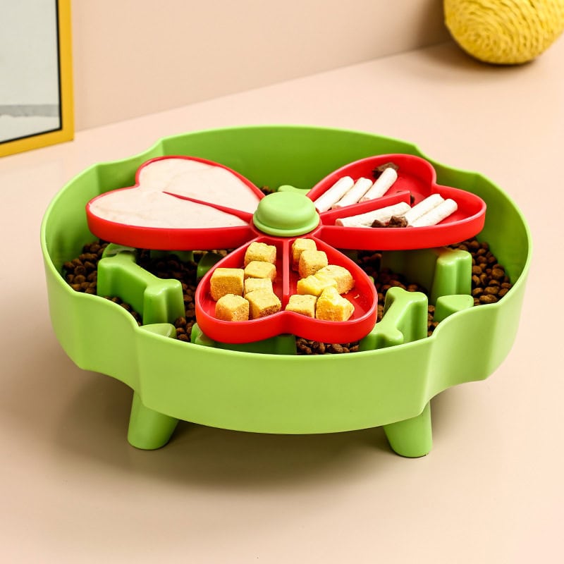 Three-leaf clover design with rotating trays and treat compartments. Helps slow feeding, prevents choking, and promotes healthy digestion while providing fun mental exercise.