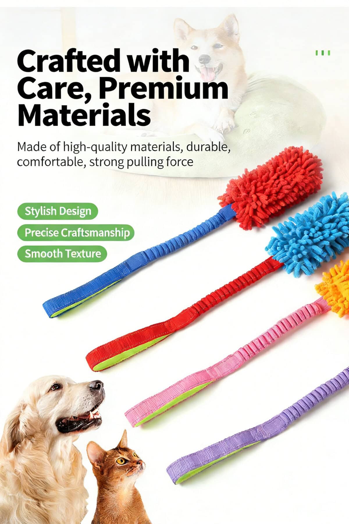 Made from high-quality polyester materials, the plush section offers a gentle chewing experience while the strong webbing handle provides reliable pulling strength. The reinforced structure helps withstand repeated tugging, making it suitable for regular play sessions without sacrificing comfort.