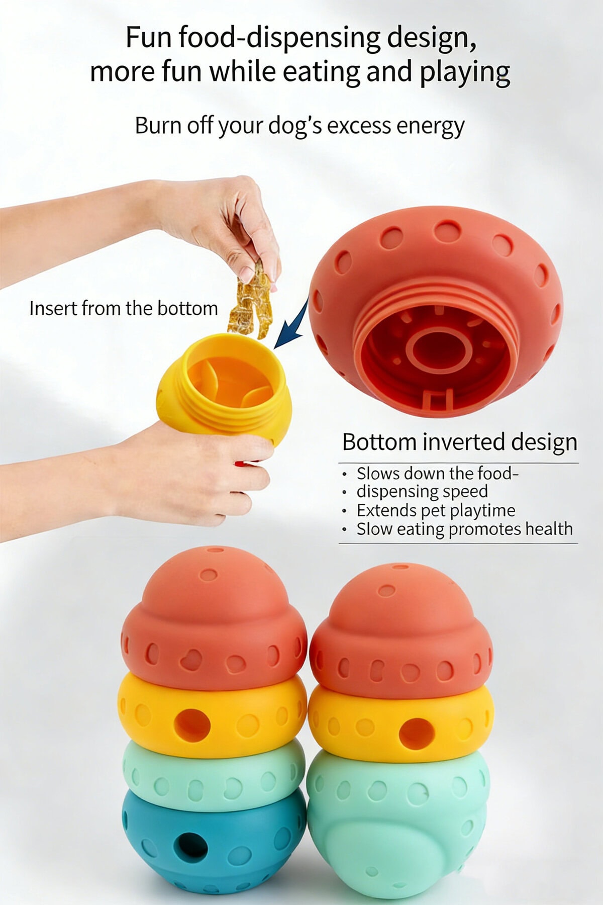 – Bottom-insert structure helps slow food release and extend playtime