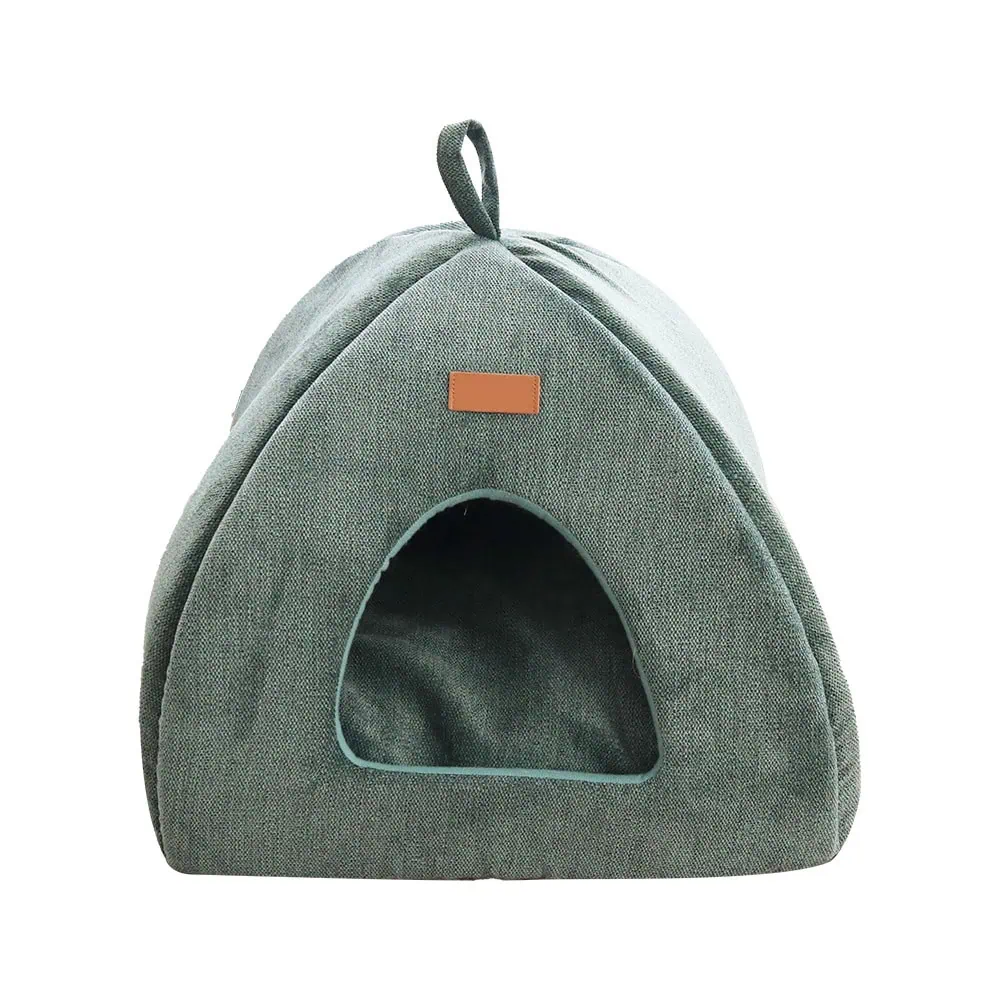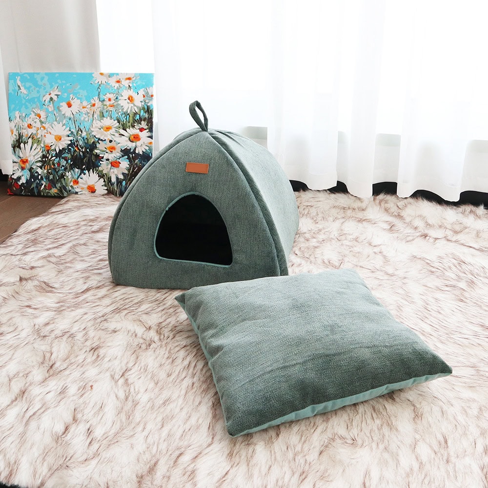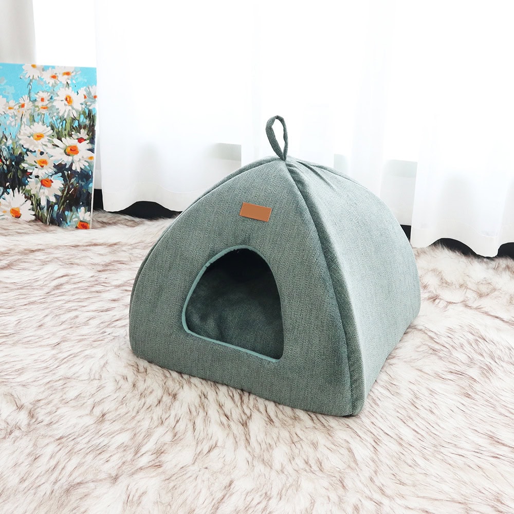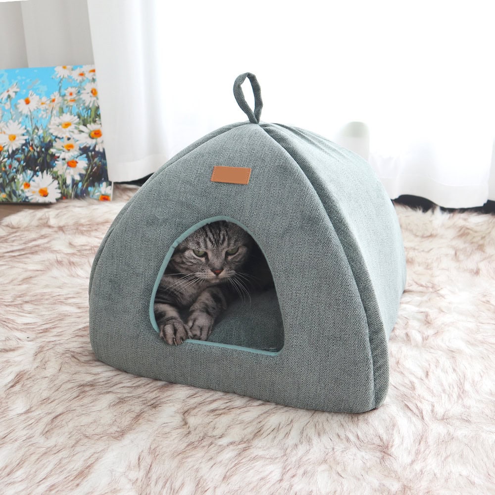 This novel cat cave features a triangular dome shape that provides a secluded retreat for privacy and security. The thick, padded walls are wrapped in a soft upholstery fabric that offers both comfort and structure. Inside, a removable cushion insert adds extra warmth and is machine-washable for simple maintenance. A handy carrying loop on top allows for easy relocation or travel, making it a versatile cozy hideout for kittens and adult cats alike.