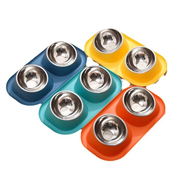 This twin pet feeding bowl set features a durable PP base with two removable stainless steel bowls. The colorful double design allows for serving both food and water at the same time.
