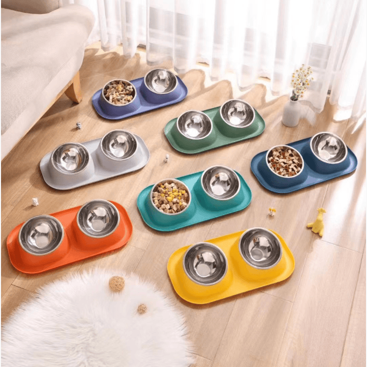 Double-bowl design with removable stainless steel inserts for easy cleaning. Non-slip base and colorful plastic tray ideal for food and water.