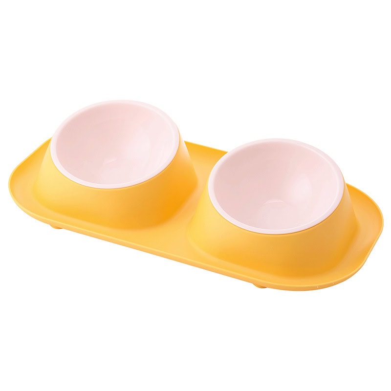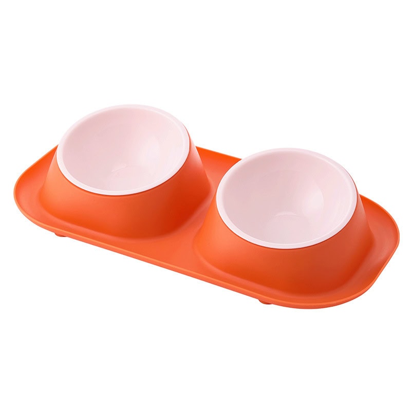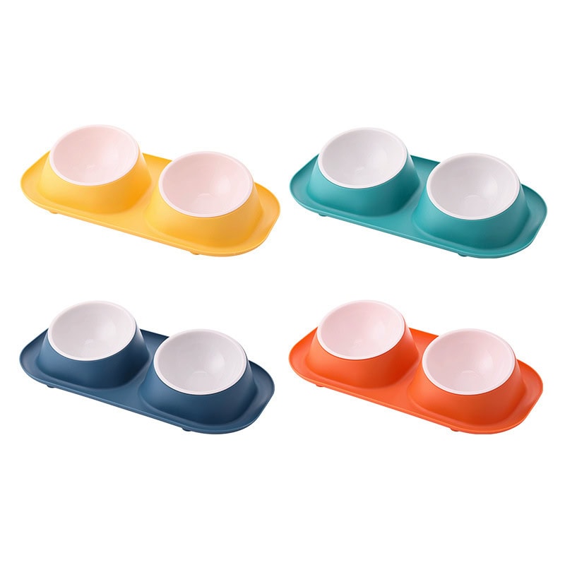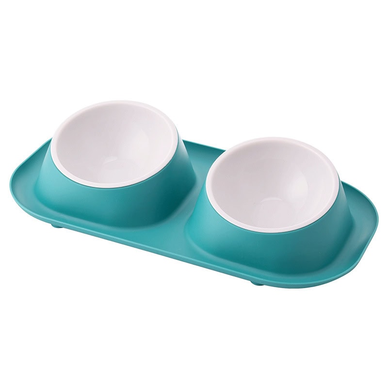 Dual-bowl design for serving food and water simultaneously. Includes removable white bowls and non-slip base, made of durable PP material.