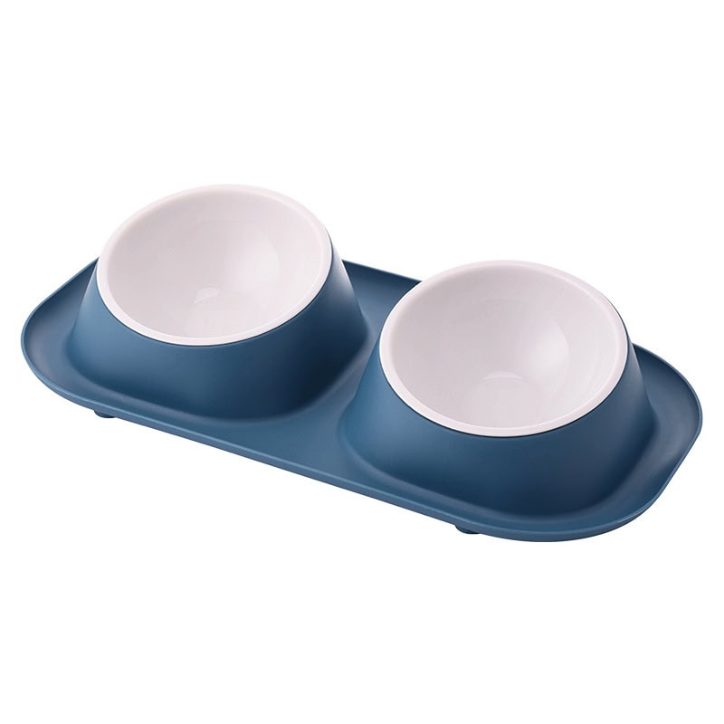This twin pet bowl set features two removable white bowls mounted on a sturdy PP base. The design allows for convenient serving of food and water at once.